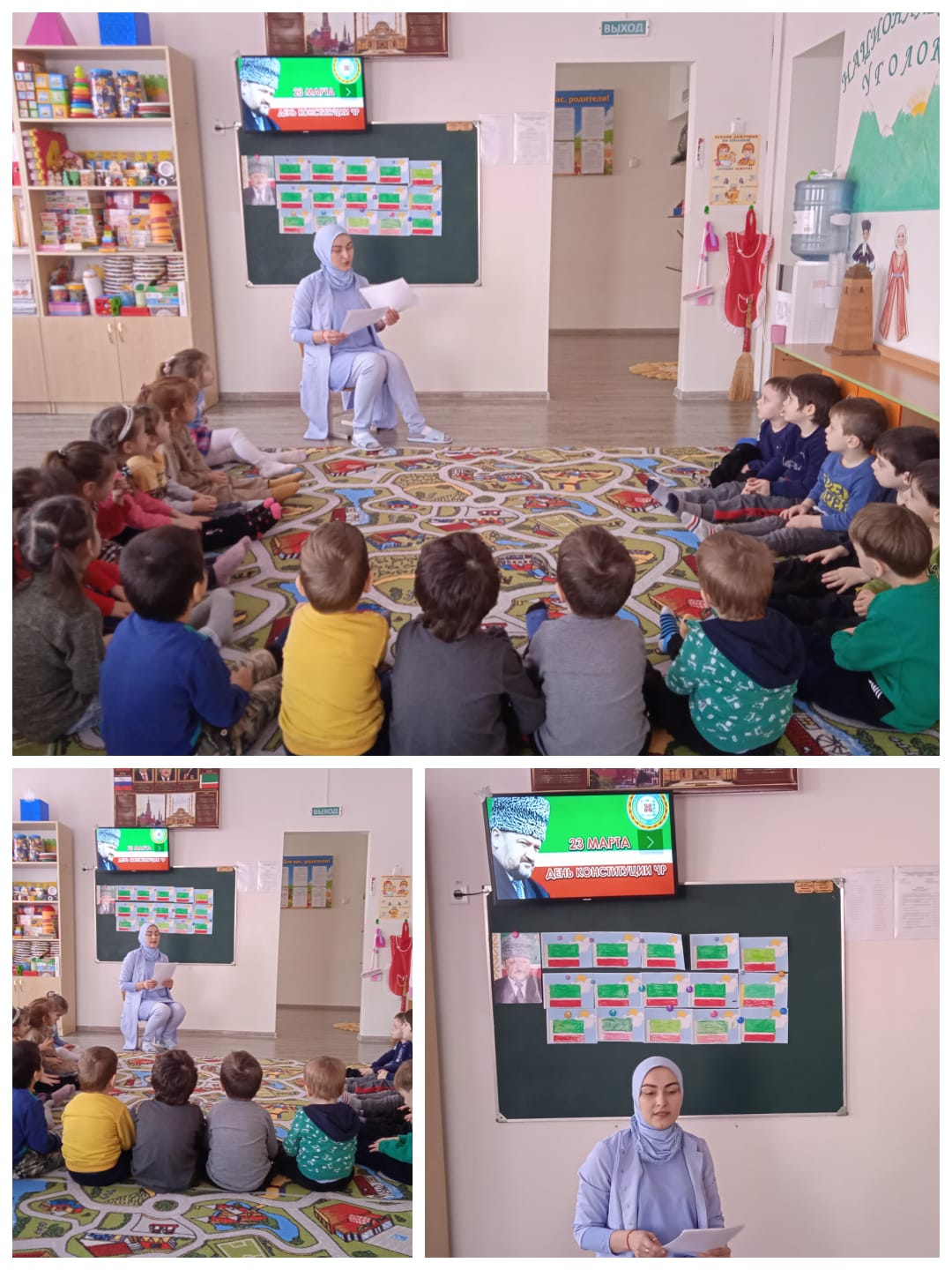 Воспитатели сопровождали свои рассказы о республике, о ее законах, обычаях и традициях демонстрацией цветных картинок, печатных изданий и видео ролика о Чечне сегодня. О последовательности Главы ЧР Рамзана Ахмадовича Кадырова в деле продолжения начинаний его отца.