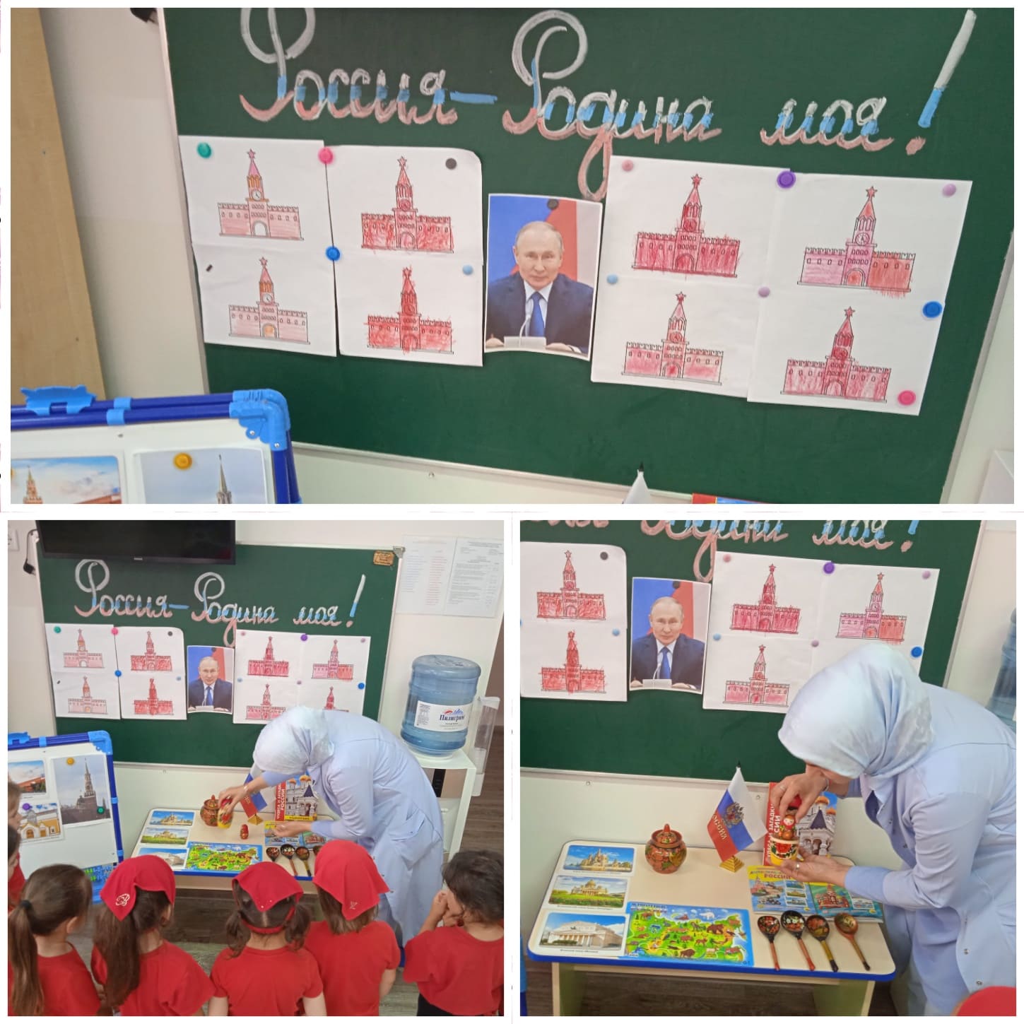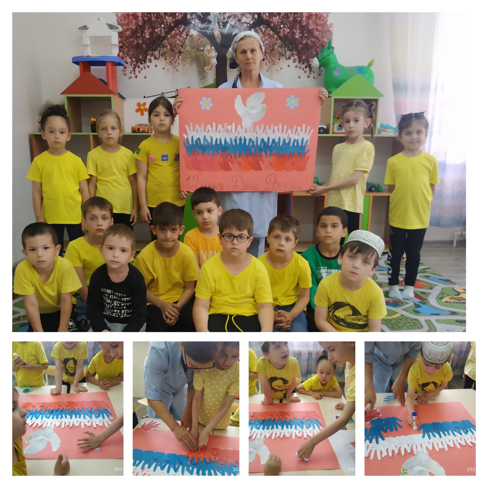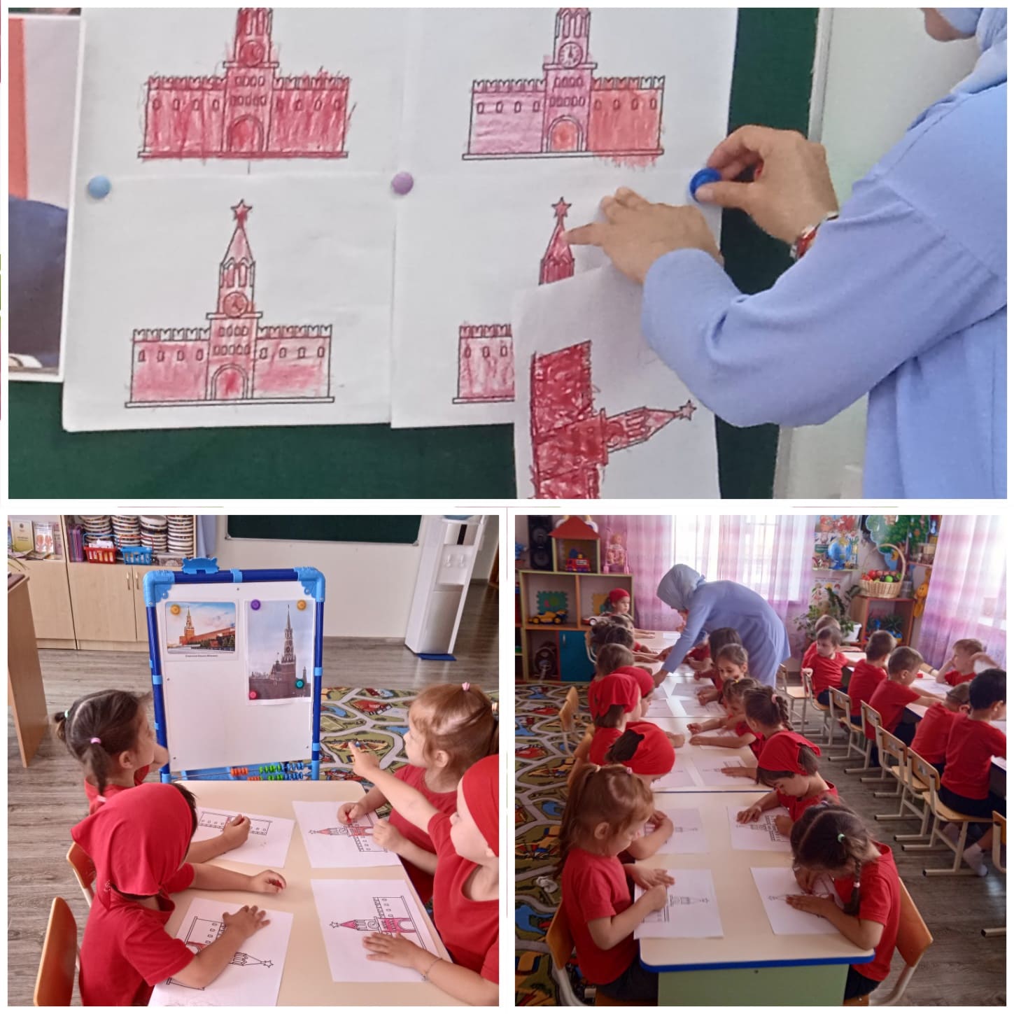 8 и 9 июня в младших, средней и старших возрастных группах были проведены занятия по аппликации, лепке и рисованию на тему «Моя родина – Россия». Малыши раскрашивали Российский триколор и Спасскую башню Кремля. Воспитанники средней группы изготавливали аппликации – плакаты, а воспитанники старших групп выполнили рисунки на асфальте, изобразив флаг России, Спасскую башню Кремля и глобус – планету Земля.