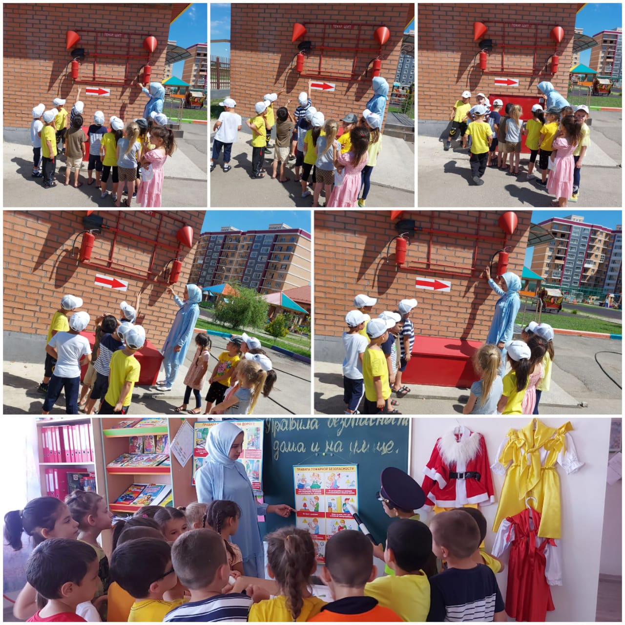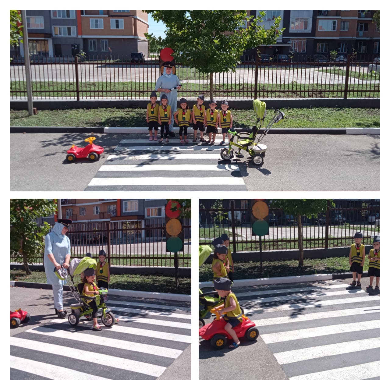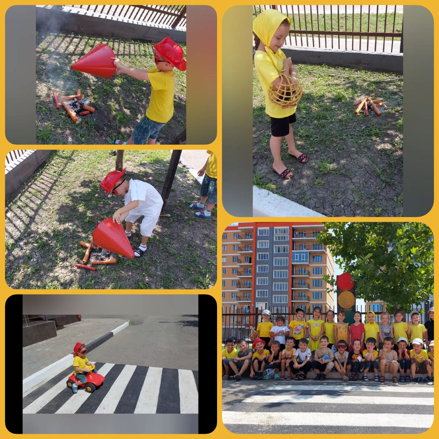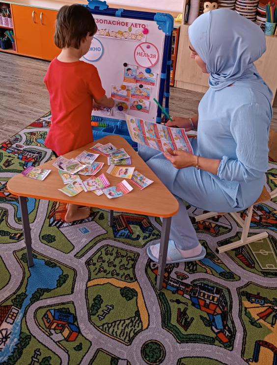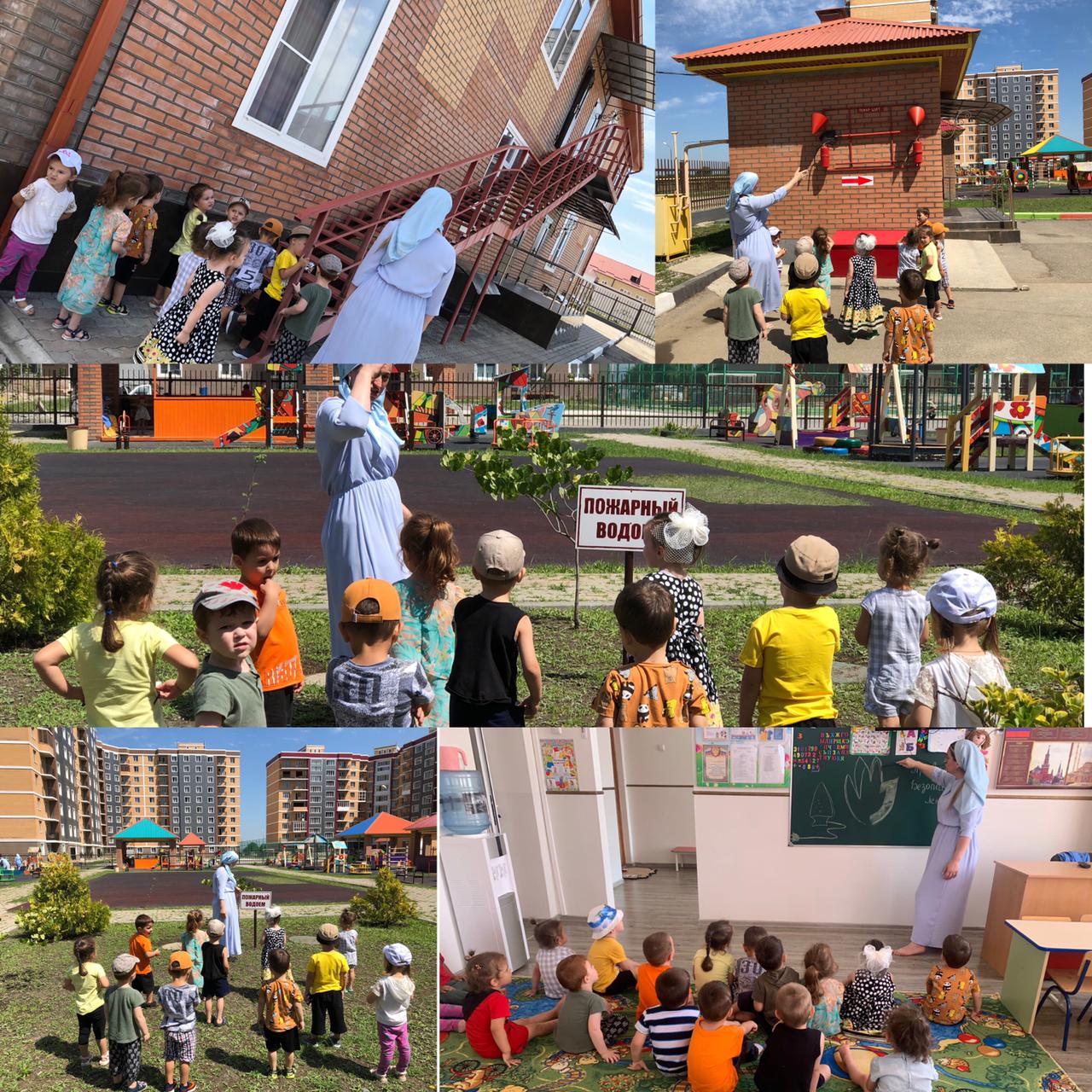 Для организации работы по профилактике детского дорожного травматизма, воспитатели на участке детского сада обыгрывали «Дорожный городок» — это асфальтированная площадка с твердым покрытием, имитирующая проезжую часть улицы, с разметкой, пешеходной дорожкой. Выносное оборудование: светофор, дорожные знаки, велосипеды, машины, коляски. Дошкольники получали знания о правилах дорожного движения в дидактических и подвижных играх, в инсценировках, обыгрывали дорожные ситуации на макетах. Педагогами на прогулках организованы наблюдения за движением транспорта, пешеходов. Мероприятия, пропагандирующие осторожное отношение к энергоресурсам в повседневной жизни – «Безопасность в быту», «Осторожно с электроприборами». Безопасное поведение в летний период на воде Безопасное поведение в лесу Открытые окна Пожарная безопасность Безопасность при общении с животными Перегрев (тепловой удар), солнечный удар, солнечные ожоги «Внимание! Съедобное и не съедобное»