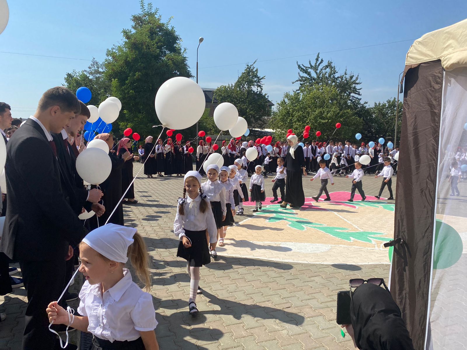 Во дворе школы, красочно украшенном, звучала громкая музыка, под которую участники праздника исполняли песни, читали стихи с особым задором, все желающие танцевали традиционную «Лезгинку».