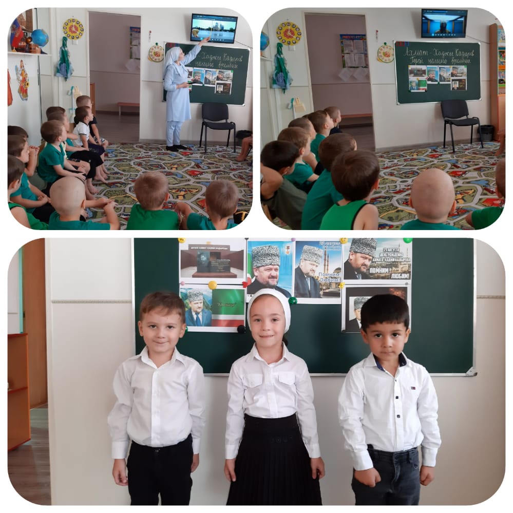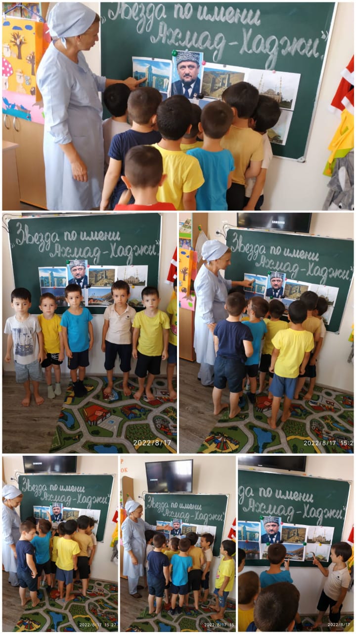 20.08.2024Справка о проведении мероприятия ко Дню рождения А-Х. Кадыровас 19 по 21 августа 2024г.Край вайнахский, милый край, Ты для нас и дом, и рай. Солнцем, песнями воспетый, Мой волшебный отчий край.Есть на Кавказе народ. Чеченцы зовутся они. Очень гордый, свободолюбивый, трудолюбивый и безмерно гостеприимный, мой маленький, но такой великий народ.Если проследить многовековую историю чеченского народа, то становится ясным, что чеченцам постоянно приходилось выживать, бороться за место под солнцем и право жить.Последний этап борьбы за жизнь пришелся на 1994 – 2000 годы. А пережить и выжить в двух беспощадных, кровопролитных военных компаниях помог простой и в тоже время выдающийся чеченец Ахмад – Хаджи Кадыров.Он дал нам всё; силы, веру и надежду на возрождение, на жизнь равными среди равных.Нашим сегодня мы обязаны, прежде всего, ему Ахмаду-Хаджи Кадырову.Республика возродилась. Цветут сады, зеленеют поля и луга. Наши дети растут в мире, в гармонии, в любви и рисуют МИР.В самом центре города построена самая большая мечеть в Европе «Сердце Чечни». Она символизирует нашу веру – ИСЛАМ, нашу силу и единство, наше желание и стремление жить, жить в мире и гармонии как нация, как народ.с 19 по 21 августа в ДОУ проводились тематические мероприятия, приуроченные ко Дню рождения А-Х. Кадырова. А именно:- в старших, средней и младшей группах были проведены беседы с детьми на темы; «Звезда по имени Ахмад-Хаджи», «Помним, любим и чтим», «Навечно в памяти людской», «23 августа – День Рождения первого президента ЧР А-Х. Кадырова»;- видео экскурсы по достопримечательным местам Чечни «Чечня возрожденная»;- воспитанники старших групп читали стихи патриотической тематики - «Мой край родной – моя Чечня»;- среди воспитанников старших и средних групп проведены спортивные эстафеты под девизом «Вырастим достойными отцов и дедов»;- рисунки на асфальте «Живи моя Чечня»;- с педагогами ДОУ проведена беседа на тему «Светлый путь А-Х. Кадырова». В ходе беседы старший воспитатель Тасуева А. Х. рассказывала о сложном, тернистом пути к миру и созиданию, через который шел, несмотря ни на что, Ахмад-Хаджи Кадыров.А завершился цикл мероприятий тематическим утренником 21 августа 2024г.Начался утренник с исполнения гимна Чеченской Республики, автором которого является А-Х. Кадыров. В ходе мероприятия дети исполнили песни «Дахий вай», «Герз лелош ма гойла», читали стихи, исполнили сценки «Ахьмад-Хьажях ляцна дийцар», «Дайх дисна г1иллакх», девичий лирический танец.И пусть звезда по имени Ахмад-Хаджи хранит нас и впредь, хранит и освещает нам праведный путь в светлое будущее. АМИН.