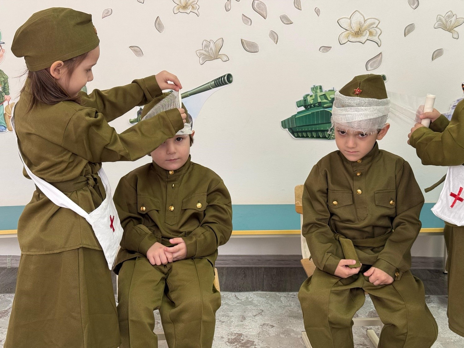 Ребята рассказывали стихи, пели песни, исполняли в игровой форме танцы «бравых солдат», соревновались в военных хитростях и смекалке, медсестрички накладывали перевязки «раненным» бойцам.